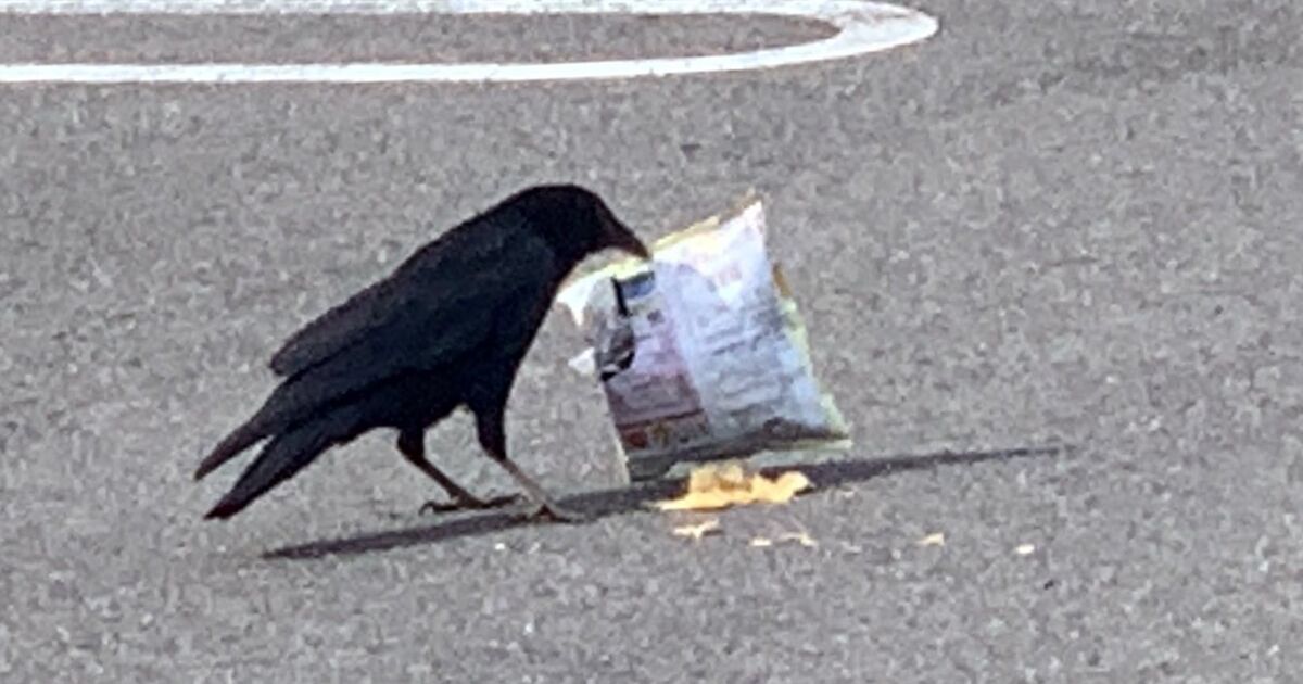 未開封ポテチの袋を抱えて飛んできたカラスさんの災難が可愛いやら